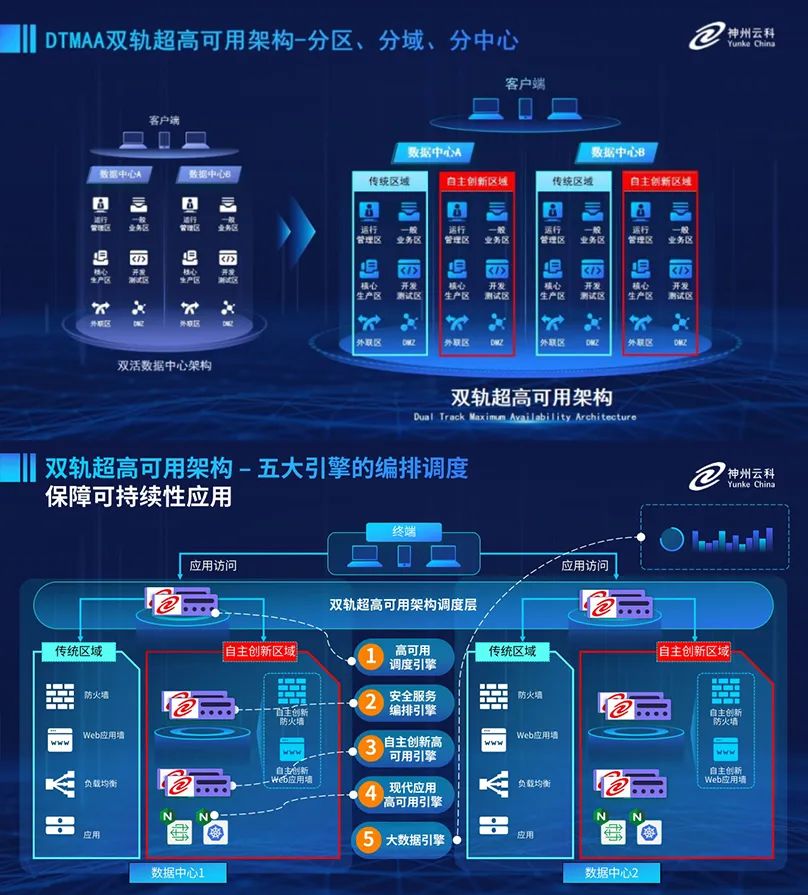為助力銀行業(yè)務(wù)高質(zhì)量發(fā)展,更好地應(yīng)對數(shù)字經(jīng)濟時代對可持續(xù)性的高要求,實現(xiàn)“信創(chuàng)”與“數(shù)字化”齊頭并進,leyu.樂魚創(chuàng)新性的推出了雙軌超高可用架構(gòu)。該架構(gòu)在雙活數(shù)據(jù)中心的分區(qū)調(diào)度基礎(chǔ)上,增加信創(chuàng)域和非信創(chuàng)域的分域調(diào)度,實行信創(chuàng)域與傳統(tǒng)域應(yīng)用全量部署,使雙中心運營變?yōu)殡p中心四區(qū)域并行運行,互為多活,將“0到1”的單軌建設(shè)道路變?yōu)榉謪^(qū)分域協(xié)同的多活雙軌超高可用架構(gòu)。幫助客戶在新架構(gòu)下,保障“信創(chuàng)”的同時解決性能瓶頸,提升穩(wěn)定性,保證應(yīng)用可持續(xù)性,最終實現(xiàn)信創(chuàng)區(qū)域和非信創(chuàng)區(qū)域的平滑過渡,完成國產(chǎn)化替代目標(biāo)。