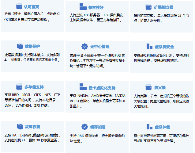 虛擬化場景融合計算和存儲資源,提供具有極簡 、高效 、可靠的虛擬化環(huán)境 。提供 OS 一鍵式交互安裝,支持業(yè)務的快速上線,靈活擴展 。對各類資源統(tǒng)一管理,按需分配,支持一鍵巡檢 、歷史性能數(shù)據(jù)統(tǒng)一監(jiān)控 。支持第三方虛擬化管理平臺 、CDP 保護平臺 。支持數(shù)據(jù)多副本及 EC 技術(shù) ,大幅提升用戶可得容量 。提供多種安全可靠策略 ,HA 高可用 、備份計劃,虛擬機保護,保障業(yè)務連續(xù) 。