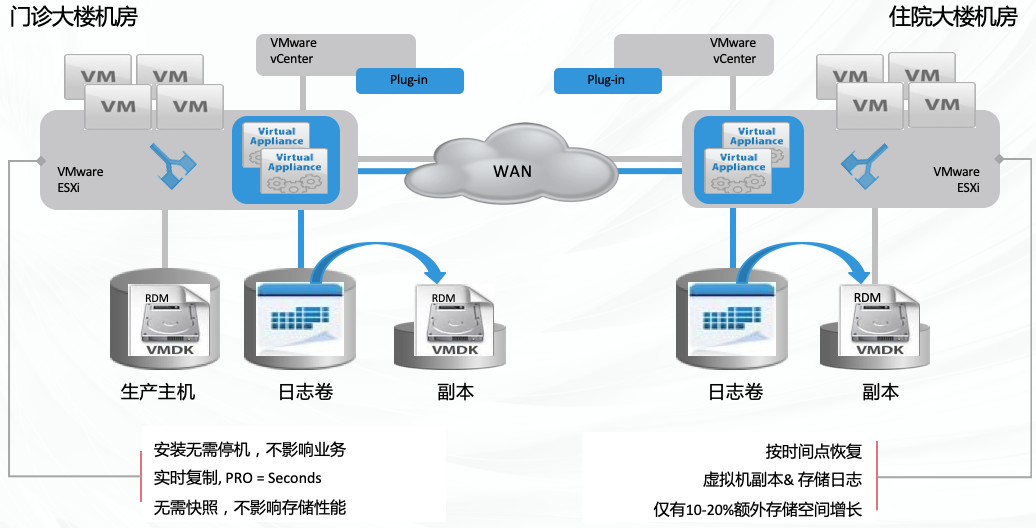 院區(qū)內(nèi)兩個(gè)機(jī)房需要協(xié)同保障業(yè)務(wù)連續(xù)性,同時(shí)要能防范因人為誤操作導(dǎo)致 重大損失的災(zāi)難,并能決速恢復(fù)系統(tǒng)。